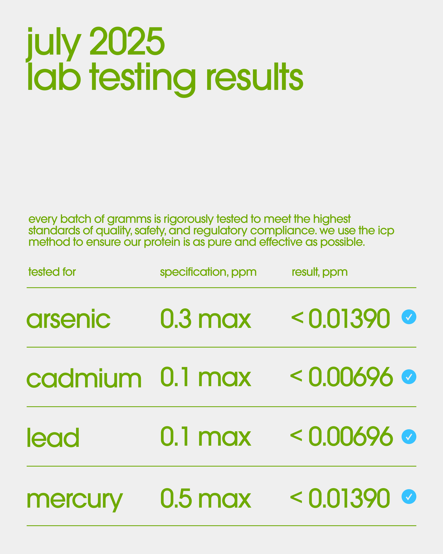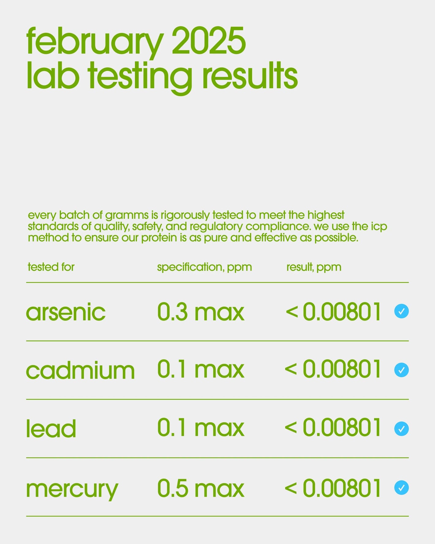 Find our third-party heavy metal testing results below, updated quarterly to reflect most recent batch testing; note that our testing factors for ppm, parts per million, to run the most exact testing possible.