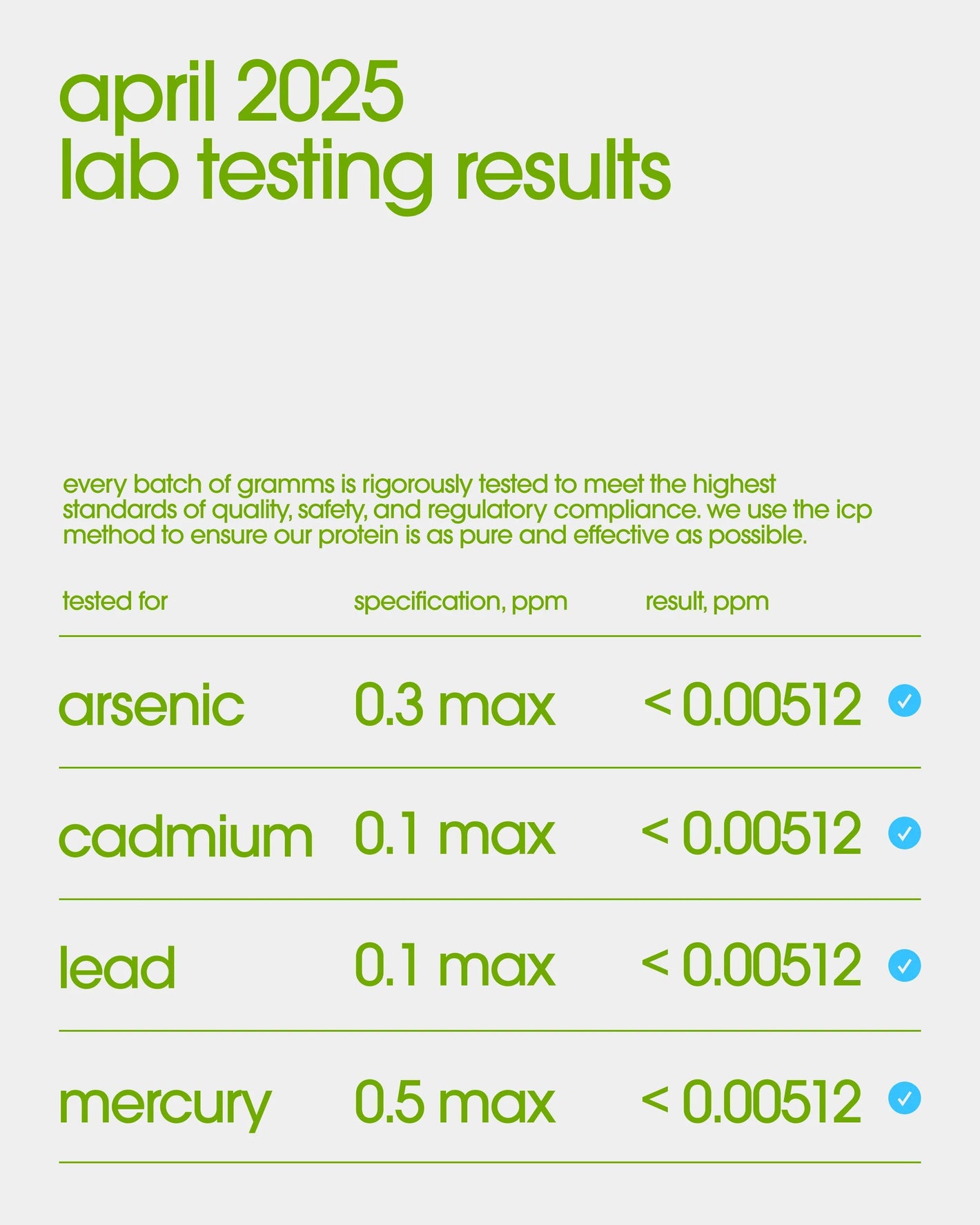 Find our third-party heavy metal testing results below, updated quarterly to reflect most recent batch testing; note that our testing factors for ppm, parts per million, to run the most exact testing possible.